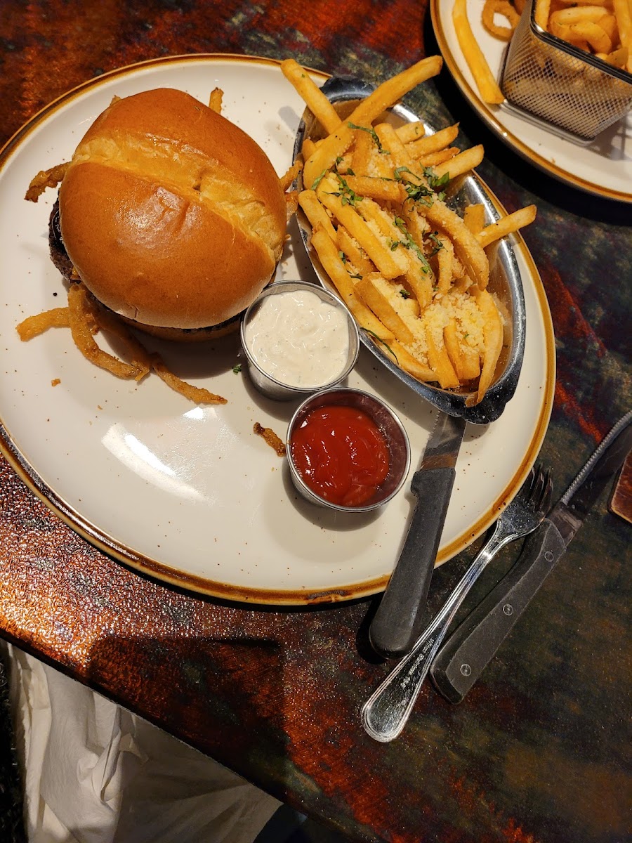 Two fer crazy good!! So a low profile place in a strip mall, once inside very nice decor. Huge bar, wall art is awesome. There with a client for Happy Hour, ordered coconut shrimp appetizer so good. And get this...buy a draft beer get served two at one time for single price...What! We both ordered the half rack of ribs... WOW! Fall off the bone delicious, get it with the raspberry BBQ sauce. So much to eat, plus a huge salad. I ordered a cocktail, what.....got two for the price of one! This is crazy cool. Our server, Bailey, was absolutely the best!! Informative, suggestions made and lots of follow ups to make sure we we good. She is awesome and added to the experience. If you are at the hotels or nearby or off the freeway or driving through...you best stop here. But have a DD cause the drinks flow so easy!
